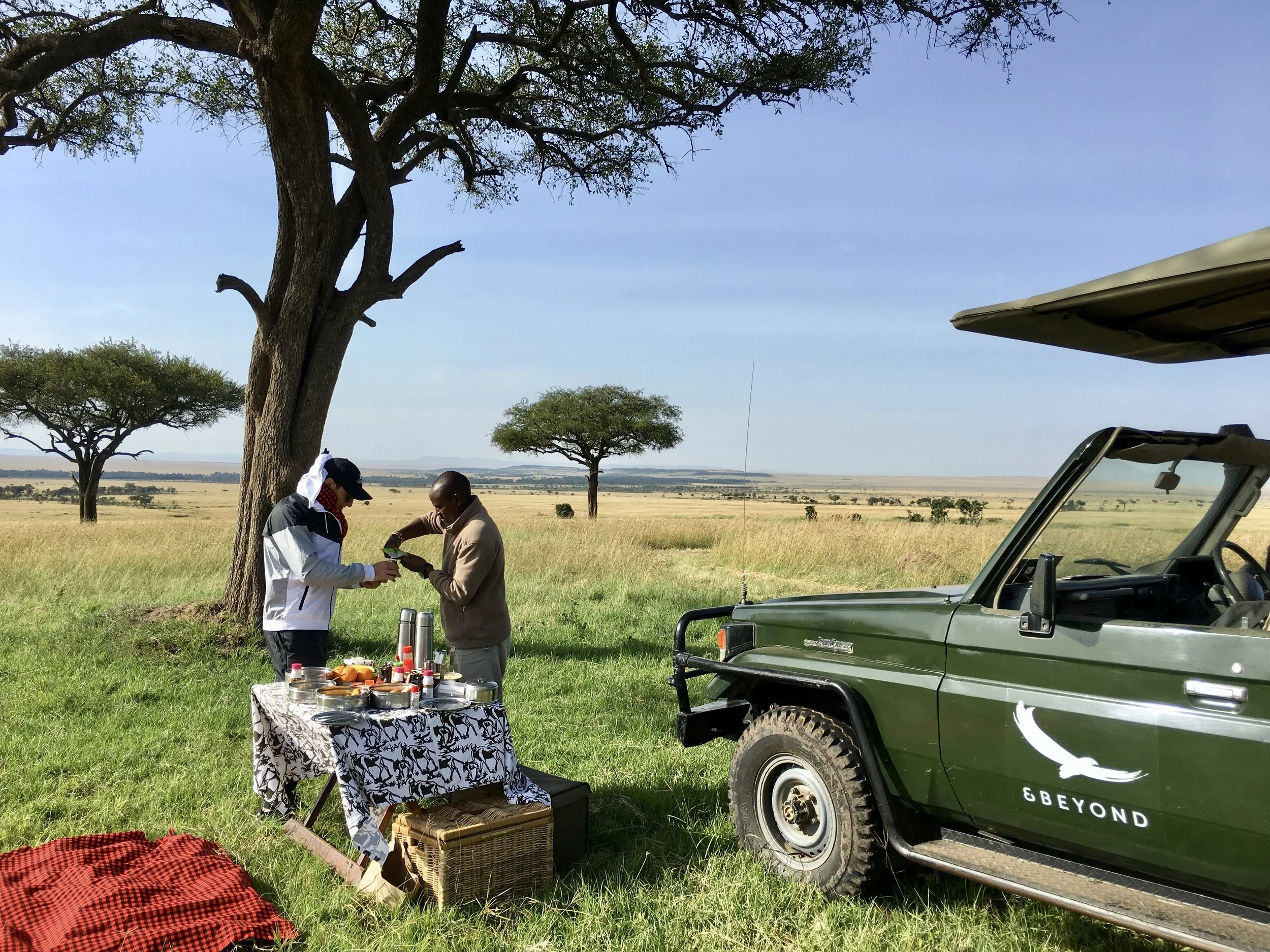 When we got hungry, we'd stop in the middle of the mara (maybe under a tree for some shade?) for breakfast. Eggs, fruit, coffee, tea, you name it!
